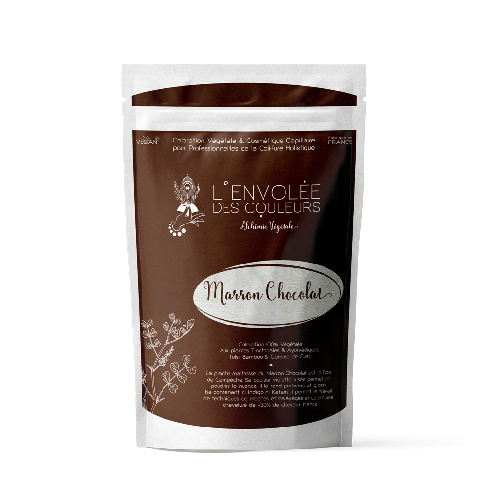 La plante maîtresse du Marron Chocolat est le Bois de Campêche. Sa couleur violette irisée permet de poudrer la nuance, il la rend profonde et glossy. Ne contenant ni Indigo ni Katam, il permet le travail de techniques de mèches et balayages et colore une chevelure de -30% de cheveux blancs.