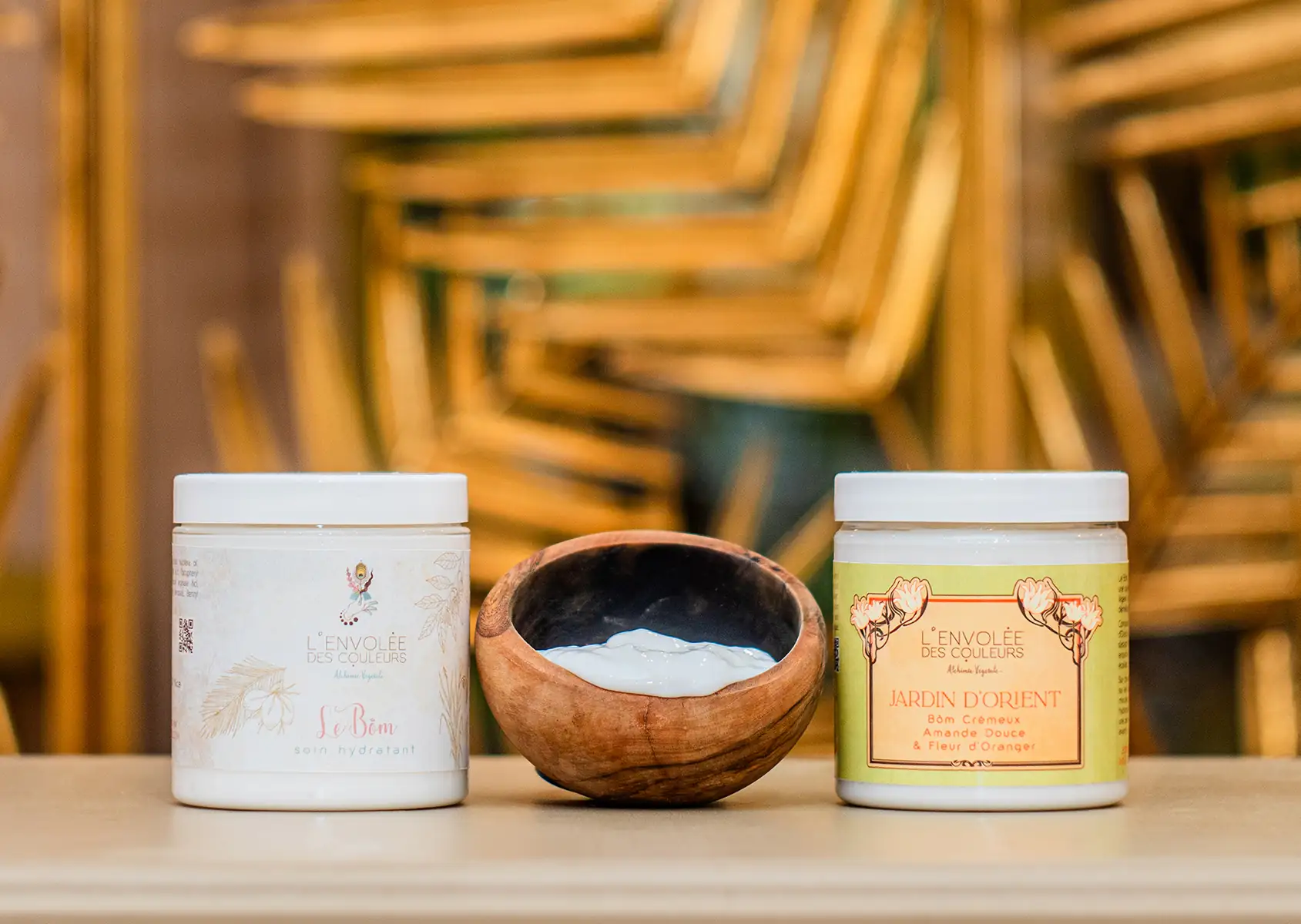 Les soins ou baumes après-shampooings intenses de l’Envolée des Couleurs sont composés d’ingrédients naturels pour offrir force, lumière et longévité à la fibre capillaire. Notre Bôm au pH acide resserrant les écailles, facilite l’expression d’une texture capillaire riche, hydratée et souple grâce à l’huile de coco ainsi qu’aux huiles essentielles d’ylang-ylang et de palmarosa. Le Bôm Jardin d’Orient offre les mêmes propriétés, cette fois par une formule sans huile essentielle, à la fleur d’oranger et amande douce. Nos deux Bôms protègent également la coloration végétale.