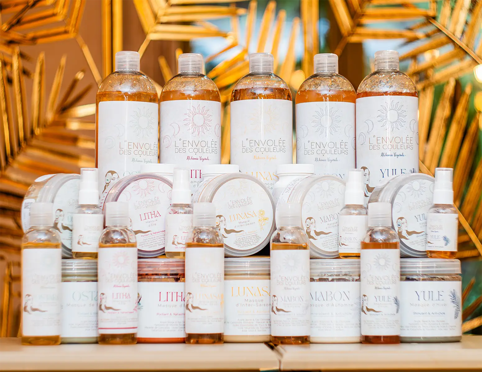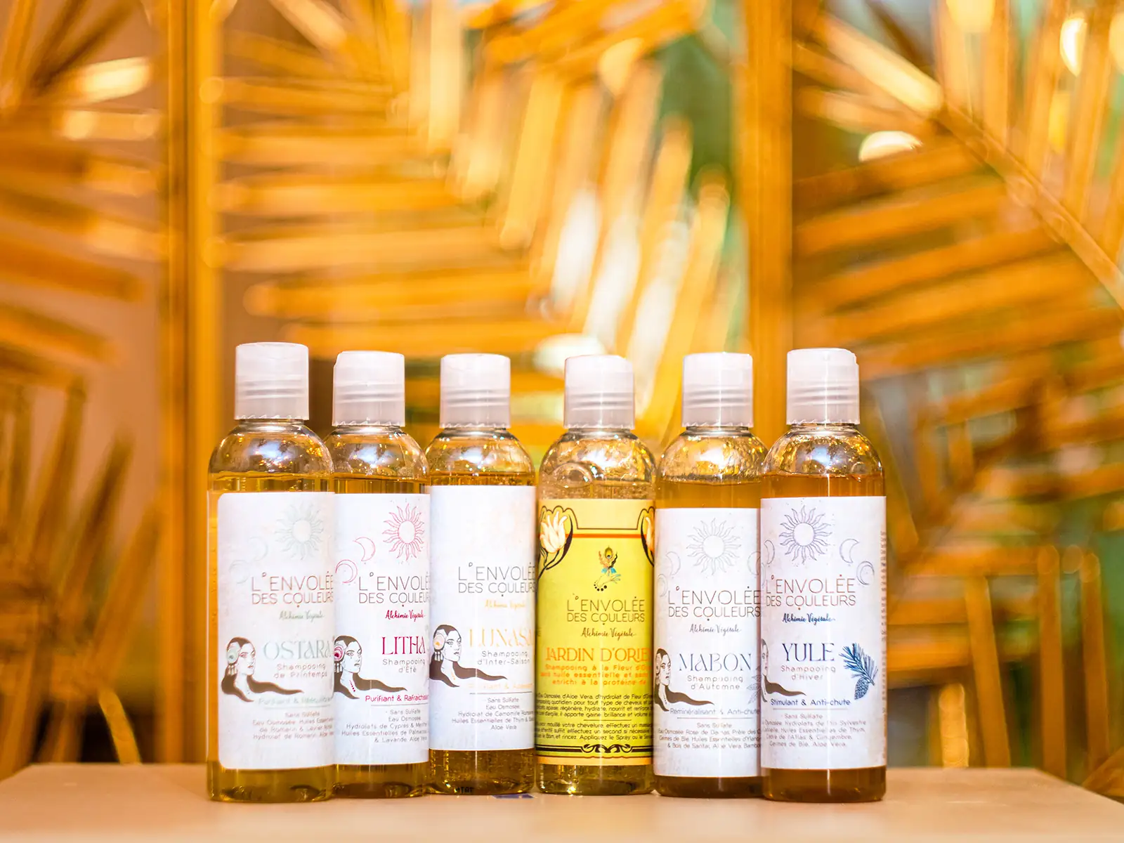 Nous avons développé 5 saisons en lien avec de multiples problématiques capillaires, quelques exemples : Ostara, saison du Printemps reliée au Bois, vise à traiter la séborrhée et les pellicules grasses dues notamment à un déséquilibre du Foie ; Litha, saison de l’Été reliée au Feu, soulage l’hyperhidrose - bien trop souvent confondue avec une séborrhée - les cuirs chevelus rouges et irrités ; Lunasa, l’Inter-Saison reliée à la Terre, traite le psoriasis et les desquamations ; Mabon, saison de l’Automne reliée au Métal, reminéralise le cuir chevelu et soigne la sécheresse ; Yule, saison de l’Hiver reliée à l’Eau, stimule la micro-circulation du cuir chevelu par ses plantes réchauffantes. Chacune réduit les chutes de cheveux dont il faut avant tout déterminer la cause.