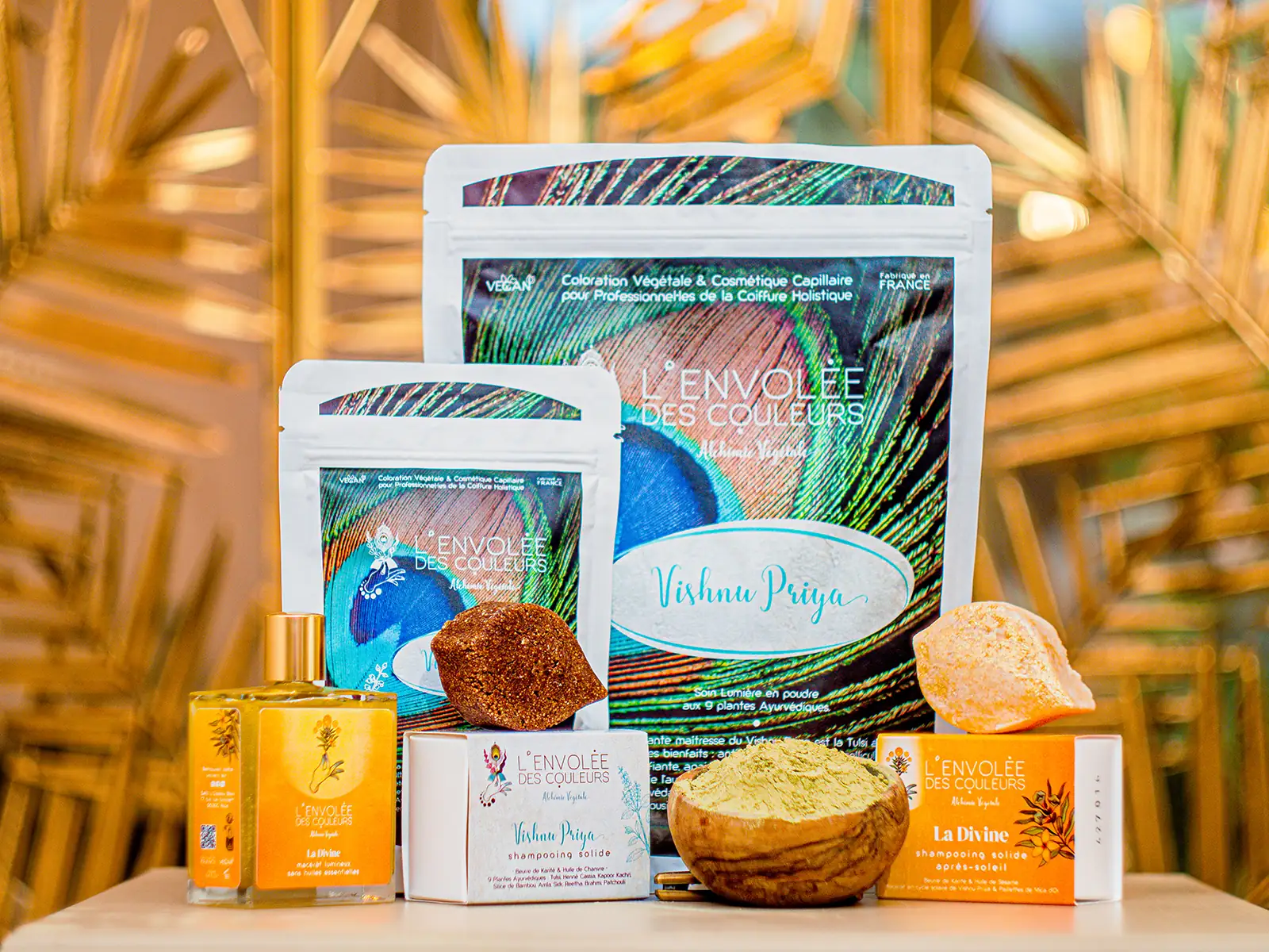 Fabriqués de façon artisanale et ancestrale, ils offrent un grand pouvoir moussant sans laisser le cheveu rêche. Les 3 shampooings solides de la Gamme Rituelle sont composés d’argiles, d’huiles végétales et d’huiles essentielles. La Divine est formulée d’huiles végétales, d’un Macérât de Vishnu Priya et de paillettes de Mica d’Or. Les 3 shampooings aux plantes tinctoriales entretiennent les colorations végétales : le Cuivré au Henné Lawsonia, le Blond Miel à base de Henné Cassia entre autres Curcuma et Rhubarbe, l’Ébène à l’Indigo qui entretient les brunes et déjaunit le cheveu blanc. Le shampooing solide Vishnu Priya, quant à lui, est notre best-seller ! Adapté à tout type de cheveux, shampooing quotidien aux 9 plantes ayurvédiques décliné du soin lumière Vishnu Priya, il sera assurément votre chouchou et celui de vos clientes, même les plus réticentes !