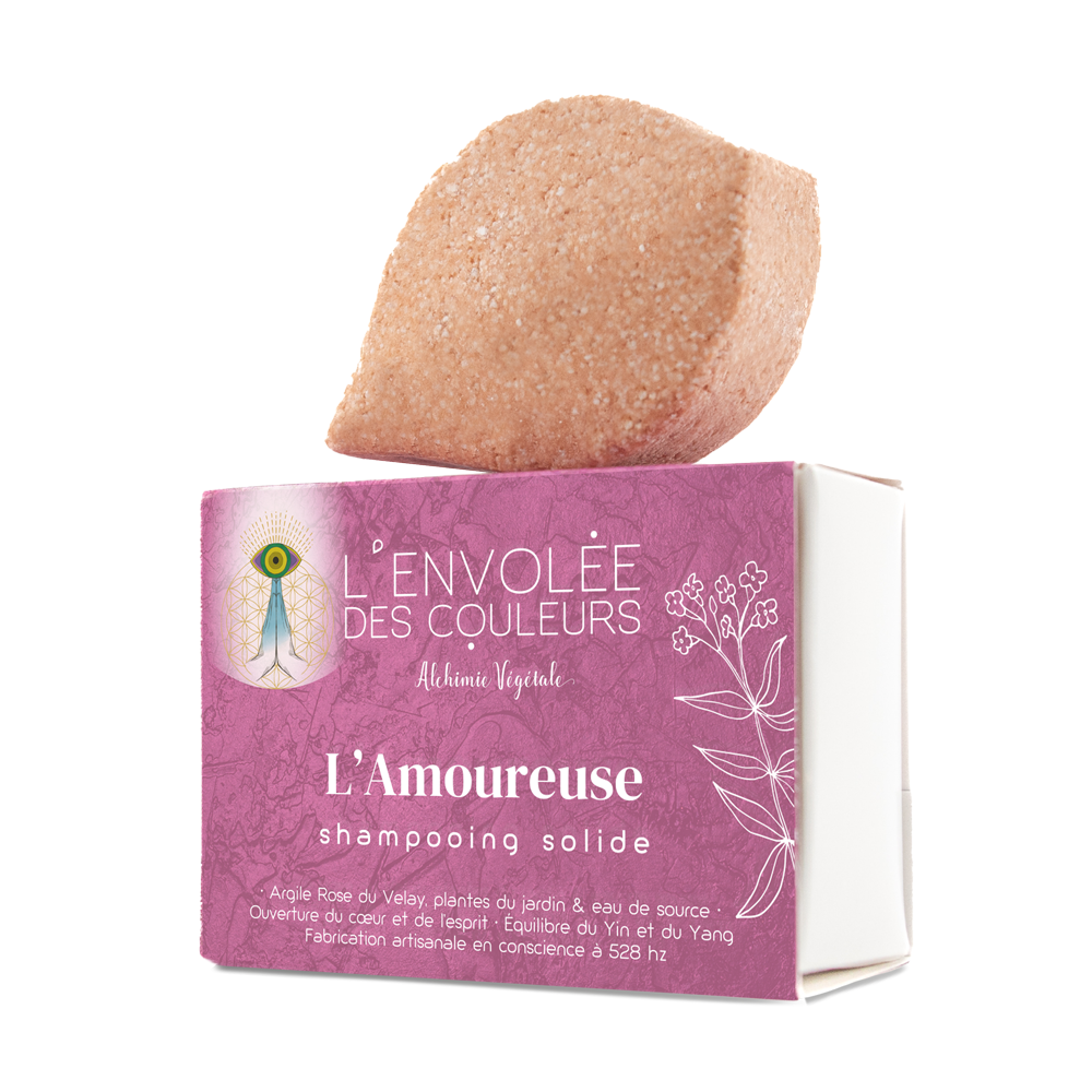 Spécialement formulé pour les cheveux et cuirs chevelus à tendance mixte, le shampooing solide l’Amoureuse est composé d’Argile Rose du Velay, d’extrait de Rose de Damas, d’Huile de Graines de Pracaxi, d’Huiles Essentielles de Palmarosa & Géranium. Grâce à sa synergie de minéraux et plantes, le shampooing solide L’Amoureuse vient assainir, régénérer et tonifier le cuir chevelu, protéger du rayonnement ultraviolet et solaires, hydrater et revitaliser. Ses propriétés cicatrisantes, antiseptiques et fongicides apaisent les inflammations et stimulent l’énergie. Son Macérât de Rose est un puissant cicatrisant, régénérateur capillaire et cutané, hydratant. Son pouvoir harmonisant psycho-émotionnel dissout les blocages au niveau du corps subtil et chasse les pensées et sentiments négatifs.