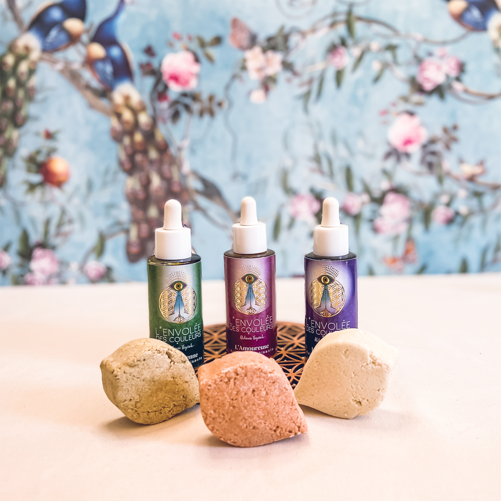 Synergie d’huiles essentielles et d’huiles végétales associées à leurs shampooings solides, sont fabriquées en conscience et de façon ancestrale et artisanale en France.